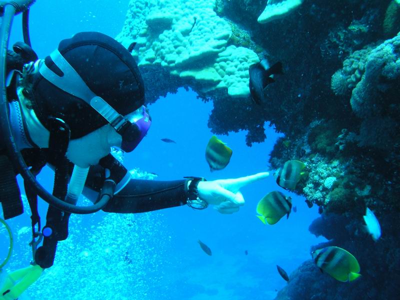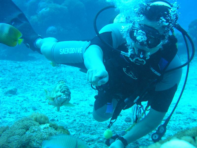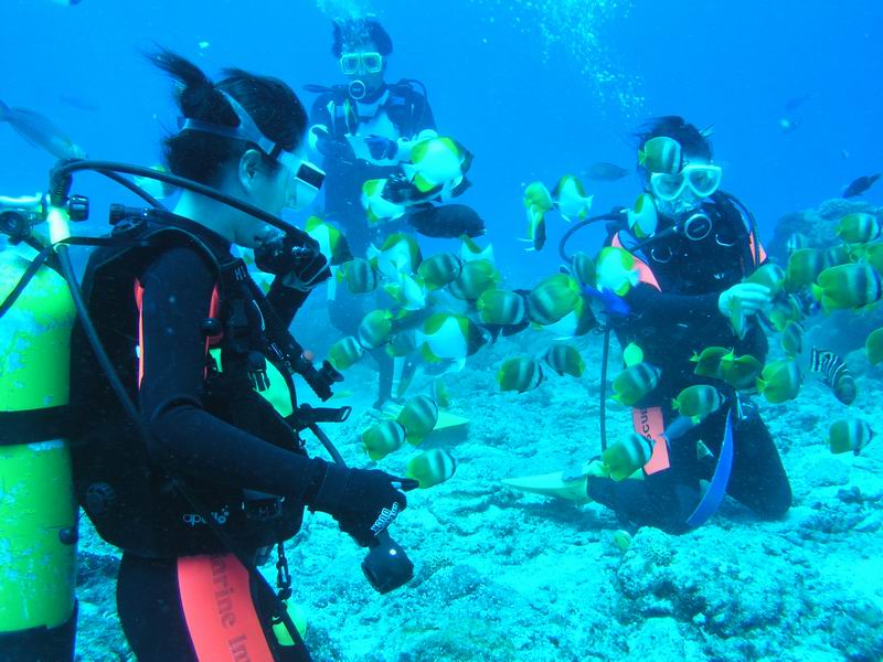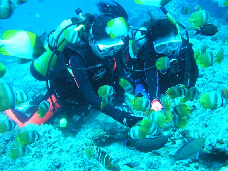 拿手指頭去餵魚的笨外國妹~~這只是蝶魚~~後來還被石斑咬了一口!!